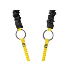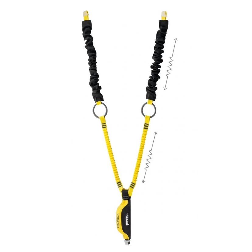 The double lanyard positioning lanyard for work at height Petzl Absorbica-Y Tie-Back is composed of a double lanyard with elastic garments, a textile-tearing energy absorber and two intermediate Tie-Back return rings.