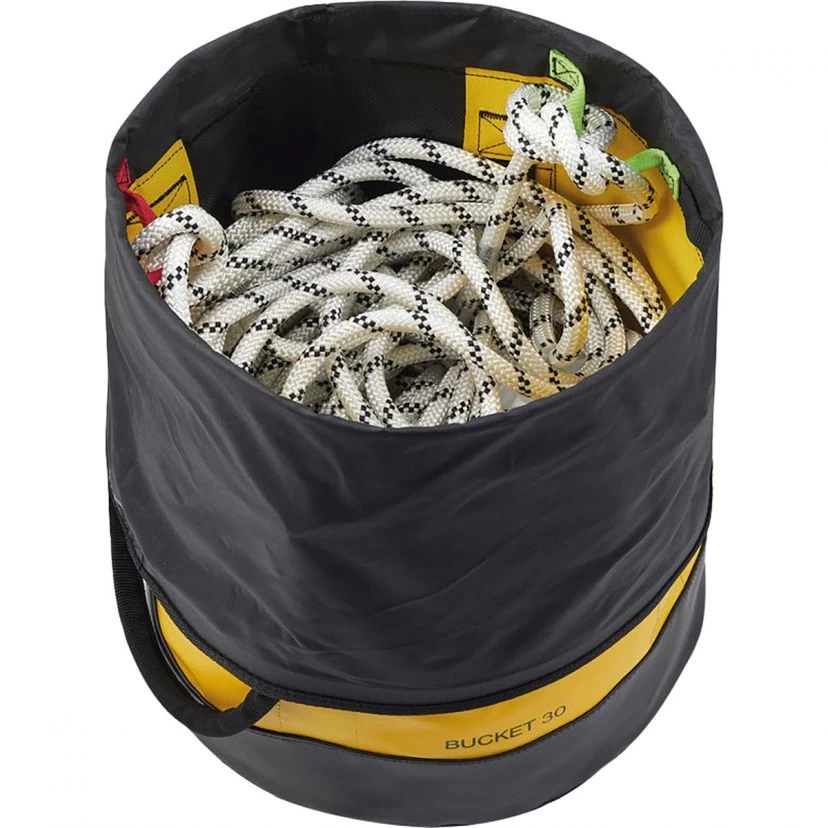 Petzl Bucket 30 is a self-supporting bag for working at height and big walls that allows you to store up to 110 meters of 11 mm diameter rope.